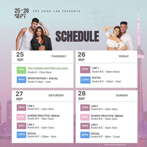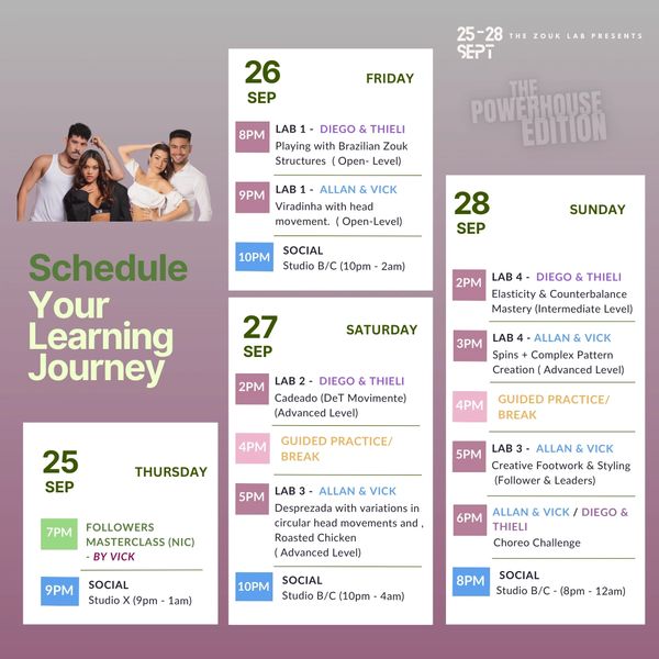 This special intensive is your chance to dive deep into the world of Brazilian Zouk and refine your skills with four of the best instructors in the industry. Each session will be designed to challenge you and help you discover new levels of expression in your dancing environment where you can explore your passion for dance.